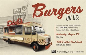 Join us at Weatherly Inn Renton on Wednesday, August 24th from 11am-3pm as we host the locally famous, Dick's Drive-In Food Truck.
