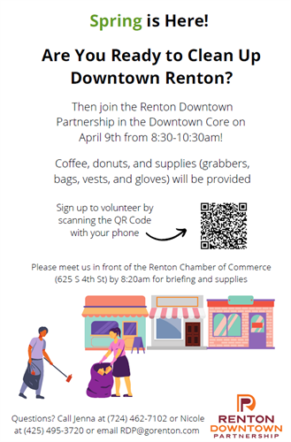 Please join the Renton Downtown Partnership for some spring cleaning of the downtown core on April 9th from 8:30-10:30am.  We will provide coffee, donuts, and cleaning supplies!