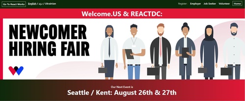 In conjunction with local and national partners, Welcome.US is excited to host its next Hiring Fair in the Seattle metro area on August 26-27! Please see details about the fair below and the link to register. Please register by Monday, August 22. What: Seattle Newcomer Hiring Fair specifically for Afghan and Ukrainian refugee applicants. When: Friday, August 26 (9am-3pm) & Saturday, August 27, 2022 (9am-1pm) Where: Hyatt Regency Lake Washington (1053 Lake Washington Blvd N, Renton, WA 98056) Employer Registration: https://hiringfairs.reactworks.org/register/employer Job Seeker Registration: https://hiringfairs.reactworks.org/register/job-seeker Volunteer Registration: https://hiringfairs.reactworks.org/register/volunteer Details: We will provide every company with a 6ft table and 3 chairs, as well as lunch for 2 staff members. We encourage partners to send at least two representatives with the authority to interview and screen candidates in order to be able to interview candidates on site.There will be an employer informational session on Wednesday, August 24 with more details. Stay tuned for that invitation. If you have any questions about the Hiring Fair, feel free to reach out to Hiringfair@Welcome.US.