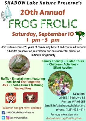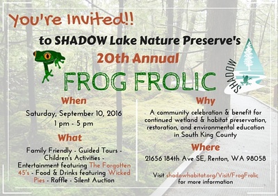 Shadow Lake Nature Preserve is a non-profit organization whose mission is to ensure preservation, restoration and environmental education in South King County. To date, the Nature Preserve has saved nearly 100 acres of land, by placing them under permanent protection. This land incorporates seven different habitats, including a 5,000 year old peat bog. SHADOW's community engagement, education programs, and volunteer events welcome nearly 3,000 local residents each year; including 1,500 students. We at the Nature Preserve believe conservation is a community-wide effort. The generous support of our community and volunteers make SHADOW’s mission possible. To express our gratitude, SHADOW is throwing a party! SHADOW Lake Nature Preserve will host the 20th Annual Frog Frolic, on September 10th from 1:00 – 5:00 PM. The event will feature live music from the Forgotten 45's, a Wicked Pies food truck, children’s activities, guided naturalist tours, and a silent auction. You won’t want to miss this festive community celebration! We are also looking for volunteers for the event as well as hosting a photo & T-shirt design contest for Frog Frolic. Learn more http://shadowhabitat.org/Visit/FrogFrolic/Volunteer http://shadowhabitat.org/Visit/FrogFrolic/PhotoTshirtDesignContest